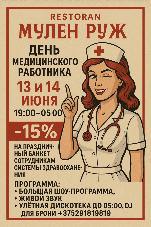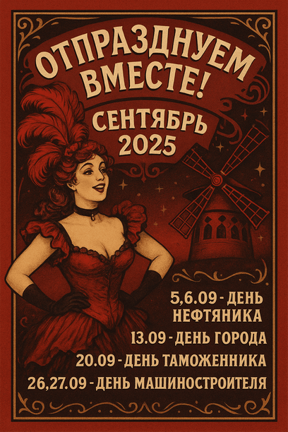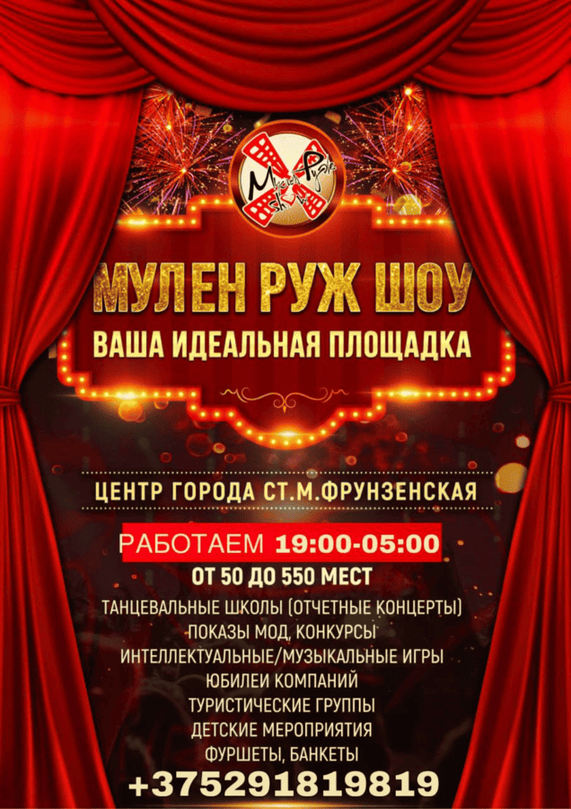 В «Мулен Руж» можно провести любое мероприятие — от романтического ужина до масштабного праздника. Пространство подходит для свадеб, юбилеев, корпоративов, вечеринок, презентаций и концертов. Атмосферу дополняют яркие шоу-программы с артистами, музыкантами и танцевальными коллективами.